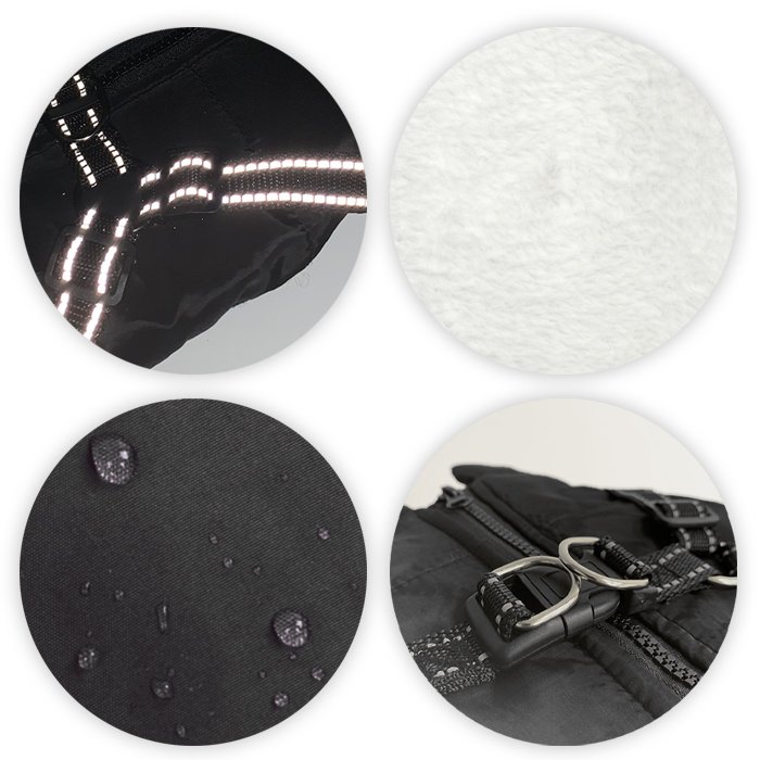 Zasnova odsevnega traku na zadnji strani učinkovito zagotavlja varnost in vidljivost psa med nočnimi sprehodi in potovanjih na prostem. Ima tudi elastični trak na trebuhu, ki je oblikovan tako, da se bolje prilega telesu vašega psa in ohranja telesno toploto. V zaprtih prostorih ali na prostem poskrbite za varno, toplo in udobno okolje za vaše ljubljenčke.