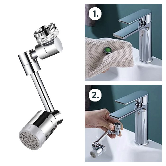 Naš 1080° vrtljiv in zložljiv razpršilni podaljšek za pipo je primeren za uporabo v kuhinjskem pomivalnem koritu, saj služi bolj prilagodljivemu pranju zelenjave, sadja, posod ali rok in lahko doseže vse kotičke umivalnika, medtem ko večina ostalih pip tega ne zmorejo. Zelo je koristno za otroke saj nekateri težko dosežejo pipo da si umijejo roke ali obraz. Za uporabo v kopalniškem umivalniku si lahko lažje umijete lase in obraz. Hkrati je podaljšek pipe z vrtečim se velikim kotom bolj priročen za čiščenje celotnega umivalnika.