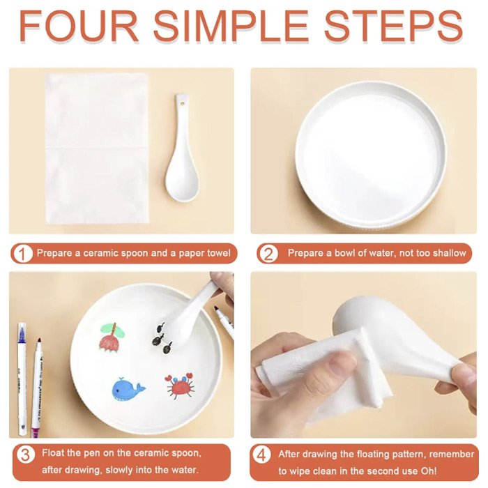 Barvito čarobno pero je za slikanje na tablo, slikanje z vodo in na katerekoli različne površine. Primerni so za otroške grafite na papirju, za pisanje in risanje na predavanjih v razredu, uporabni so tudi za pisarniške sestanke. S temi pisali si ustvarijo neskončne možnosti za ustvarjalnost, saj lahko izrišejo vse vrste majhnih rib, želve, delfine, rožice, metulje in še več, ki jih na koncu spustijo plavati na vodo.