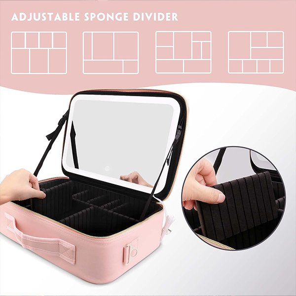Kozmetični kovček z nastavljivimi predelki.