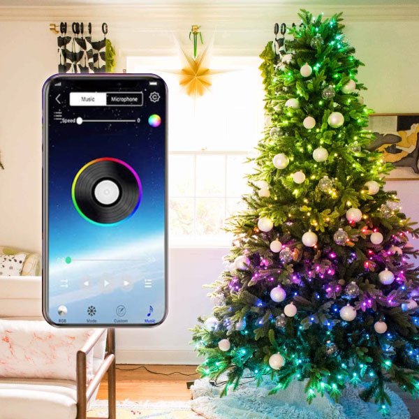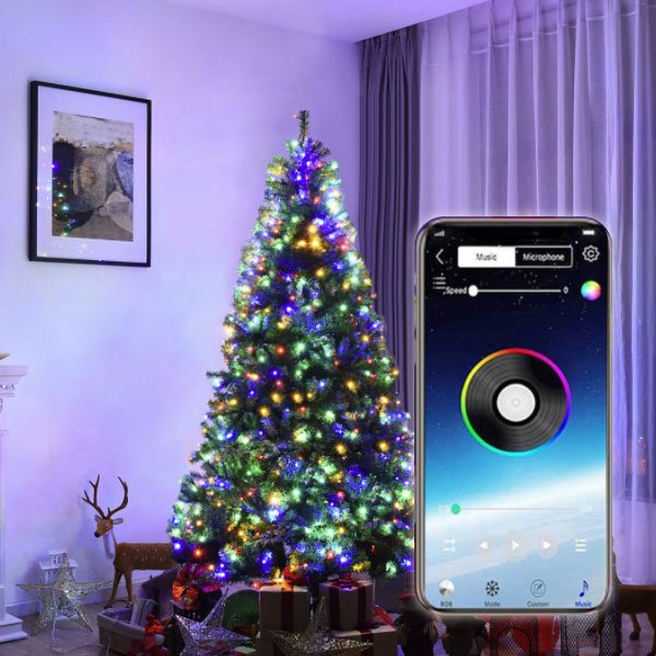 LED božične lučke za notranje drevesce z upravljanjem preko mobilne aplikacije. Izbira med barvami, svetlobnimi učinki, glasbo, svetlostjo in časovnikom.