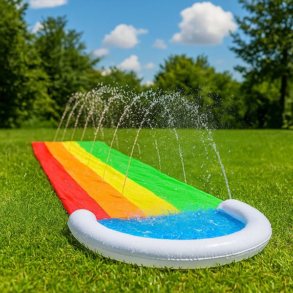 Napihljiv tobogan za vodo zagotavlja ure zabave za otroke med vročimi poletnimi dnevi.