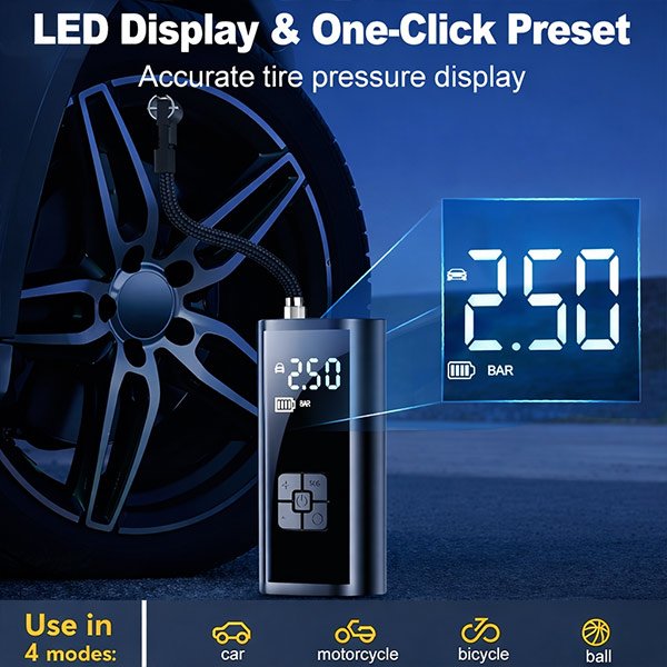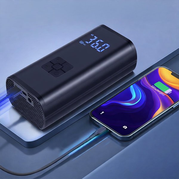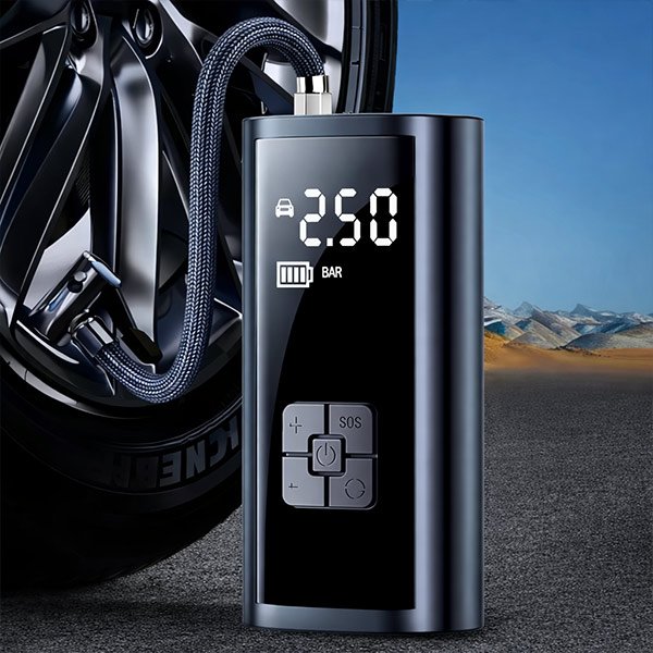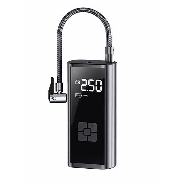 Brezžični prenosni zračni kompresor - AeroGo Serija je kompakten, ponovno polnilen zračni kompresor, zasnovan za hitro in enostavno napihovanje pnevmatik brez potrebe po priključku na stensko vtičnico ali vtičnico vozila. Namenjen je napolnitvi in napihovanju pnevmatik avtomobilov, motornih koles in koles v vsakodnevnih situacijah ter v sili na cesti ali med potovanjem. Enota vključuje stabilno podlago za varnejše rokovanje, ohišje z enostavnim oprijemom za nadzorovano uporabo, LED delovno lučko za delovanje v slabih svetlobnih pogojih in funkcijo samodejnega izklopa, ki preprečuje prekomerno napihovanje pri izbranem tlaku.