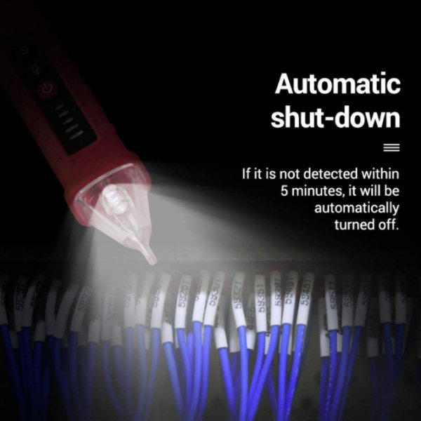 Na koncu detektorja izmenične napetosti je vgrajena močna bela LED lučka, ki vam bo osvetljevala naprave, zato da boste lažje videli v temi. Brezkontaktno pisalo se po 5 minutah nedelovanja samodejno izključi.